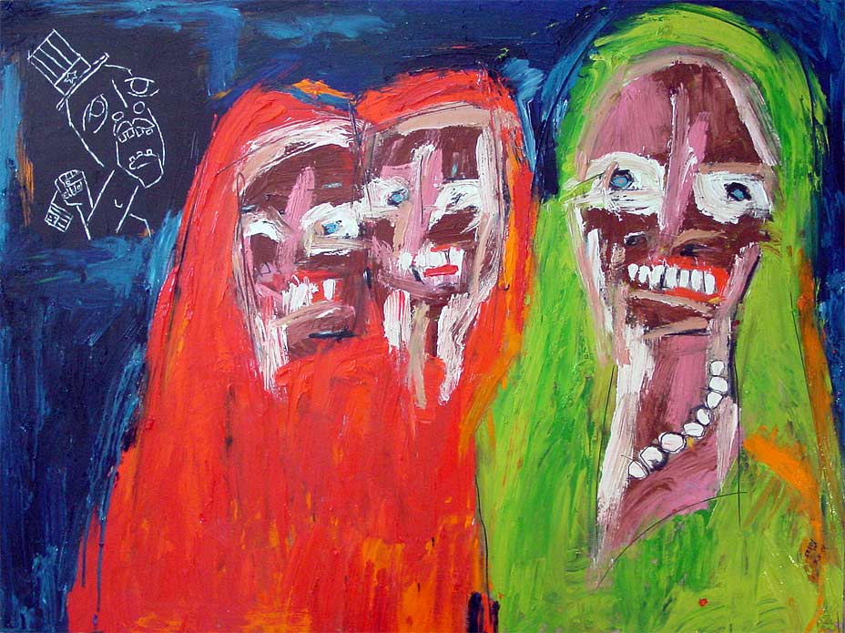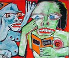 "3 of 1 million displaced Sudanese in food queue (while convention boss laments over missing balloons)" 30" x 40" oil/acrylic on chipboard "31 Days in July" 2004 project (July 31) $600 |