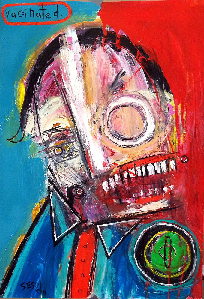 "Vaccinated" mix on watercolor paper 22" x 15" $90 email sesow@sesow.com to reserve/ask about purchasing. please include url and description. |