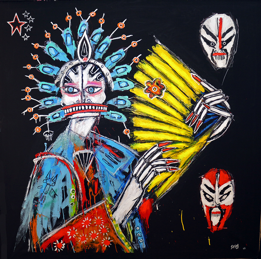 "China Theatrics" acrylic/oil on unstretched canvas approx. 45" x 45" (approx. 2" black border around) *SOLD email sesow@sesow.com to reserve/ask about purchasing. please include url and description. |