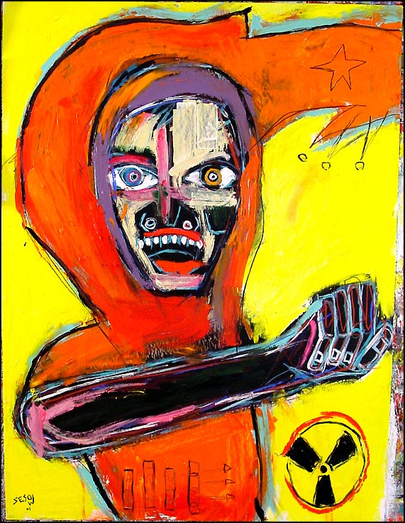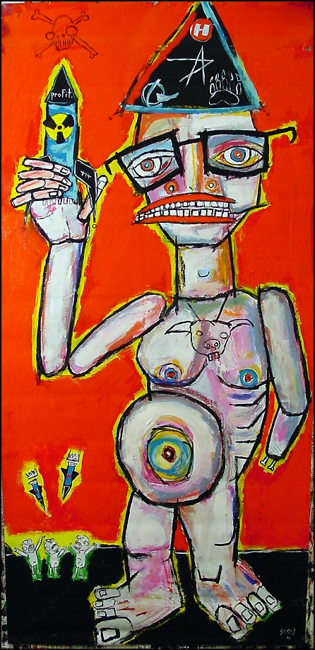 "Arms dealer" approx 30" x 70" acylic on DC street banner $700 |