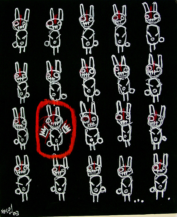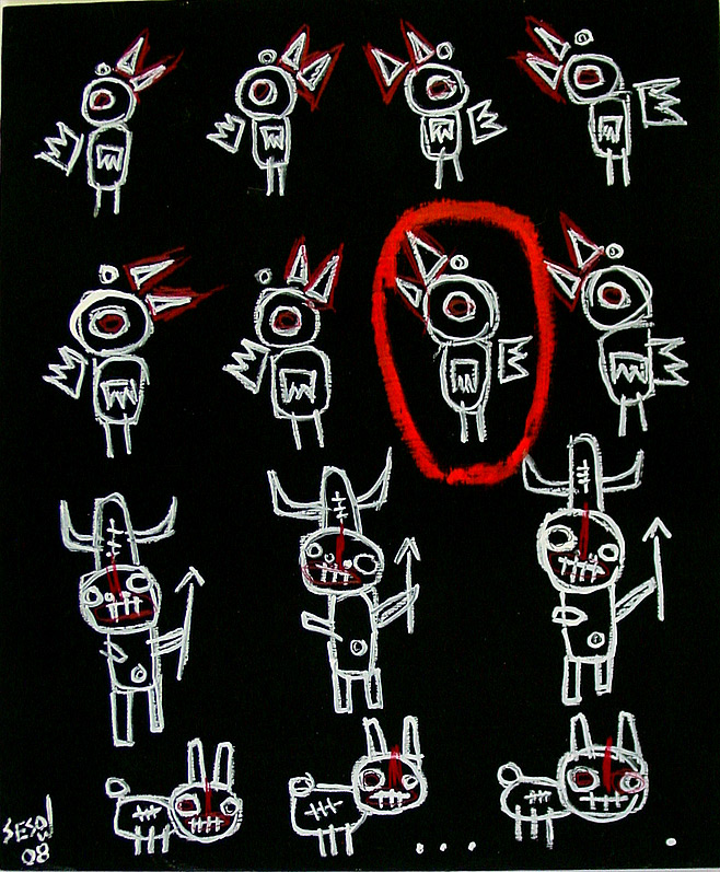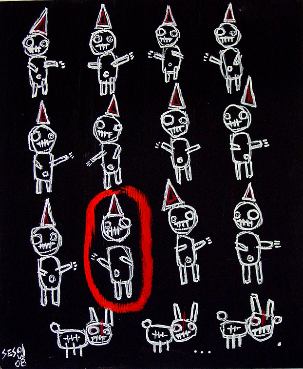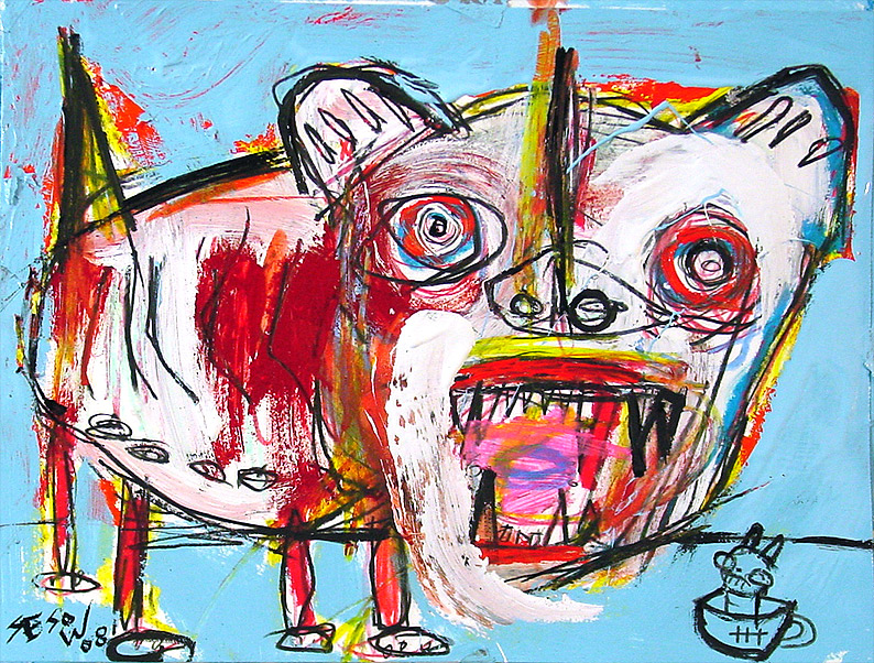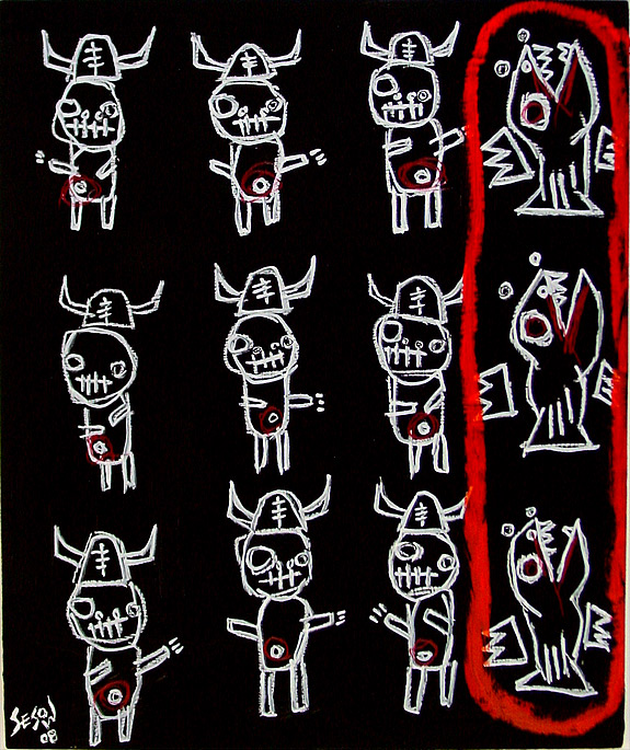 "Double Happy Lucky" 21" x 29.5" x 1" oil/livestock marker/mixed on wood table old ikea painting table used in sesow studio, 2001-2008 $500 |