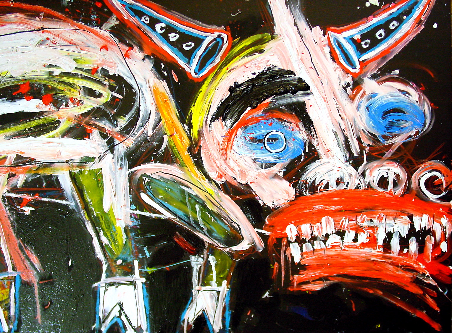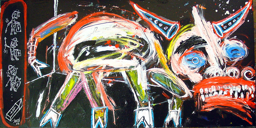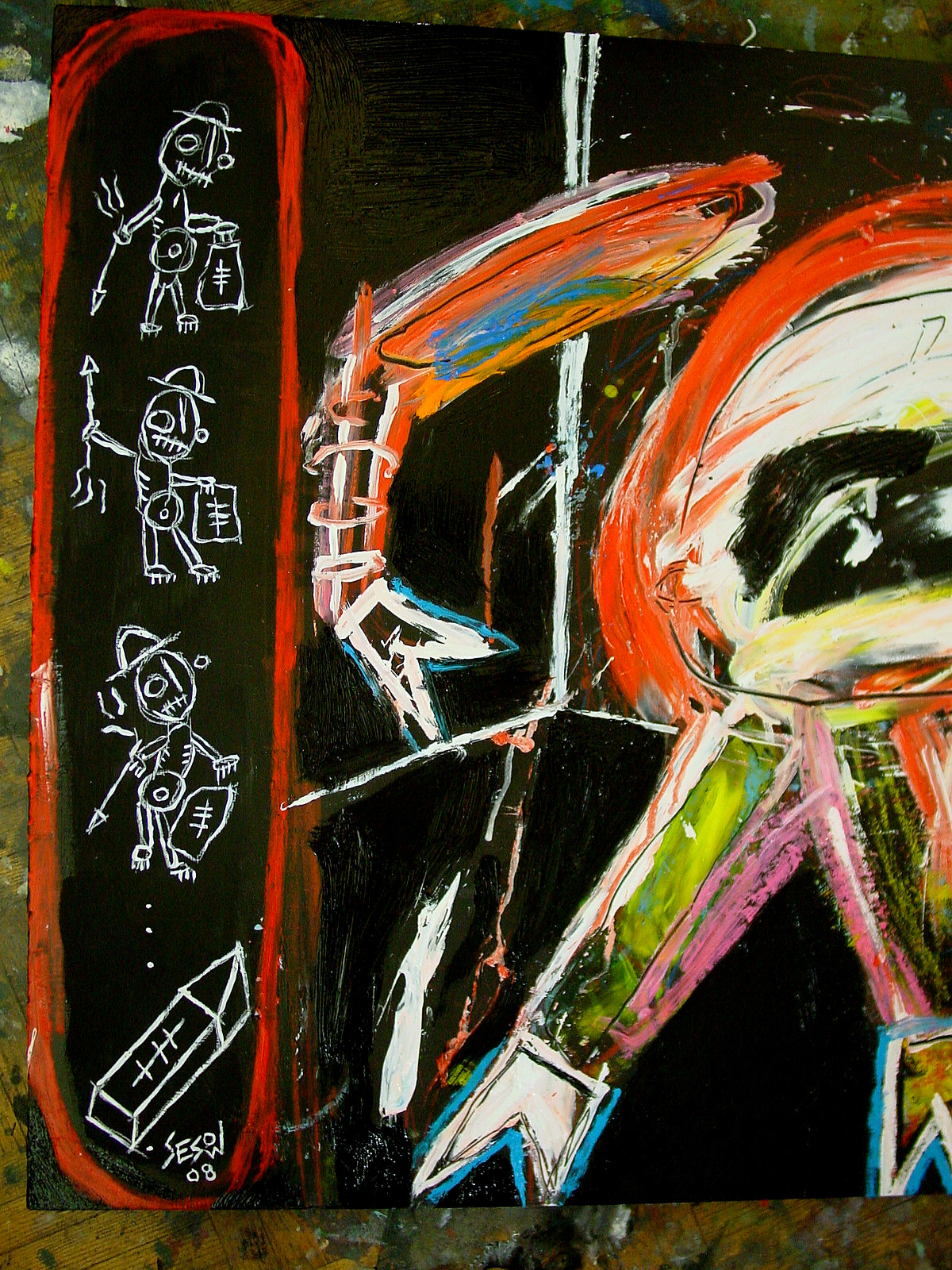 "Don't Give Up, the fight" 47" x 23.5" x 1.75" oil/livestock marker/mixed on wood table old ikea painting table used in sesow studio, 2006-2008 *SOLD DETAIL #1 ... DETAIL #2 ... full painting |
