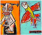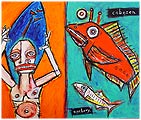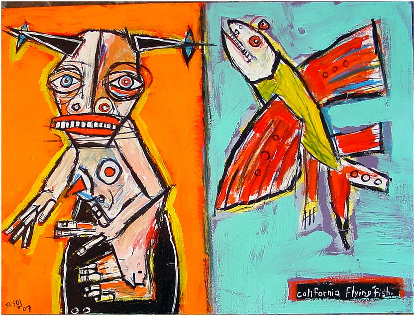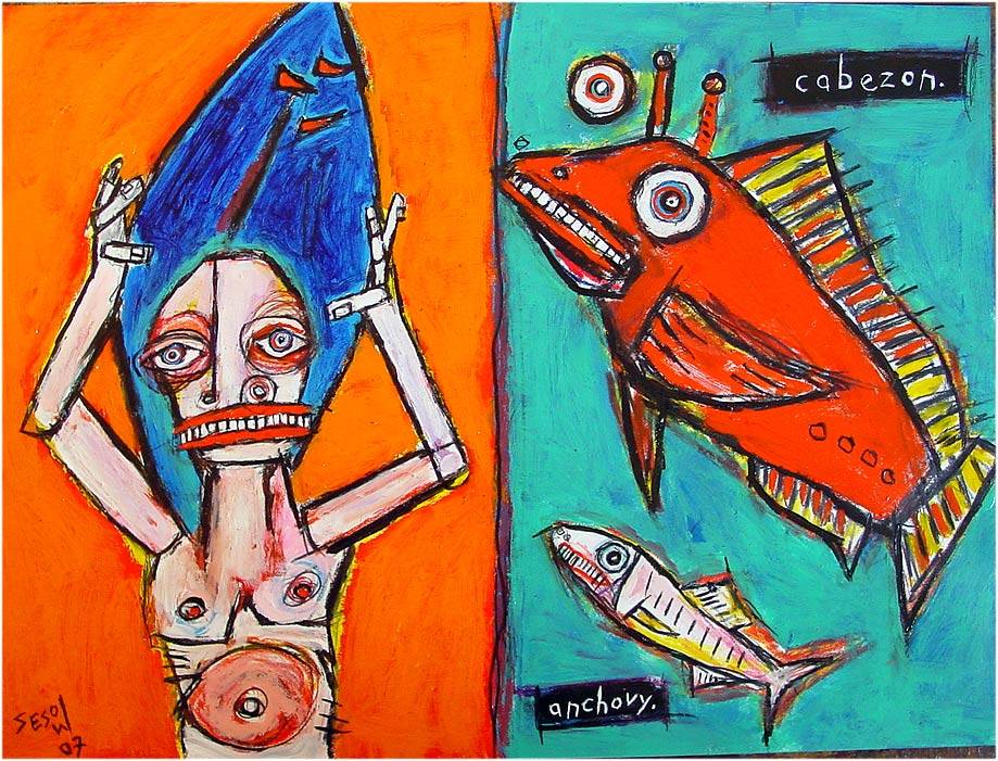 "Surfer (with cabezon and anchovy)" 15" x 20" acrylic/mixed on matboard *SOLD |
