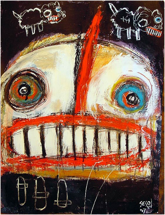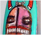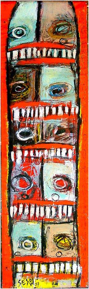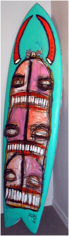 "Grand Poobah" approx 5' 6" x 14" acrylic/mixed, on surfboard created for Sesow's Salvaged show in Oceanside, CA, visit here *SOLD i dunno? contact sesow@sesow.com for more information or call d gallery at 760-805-0423 image shows board before glassing, finished board will be glassed |