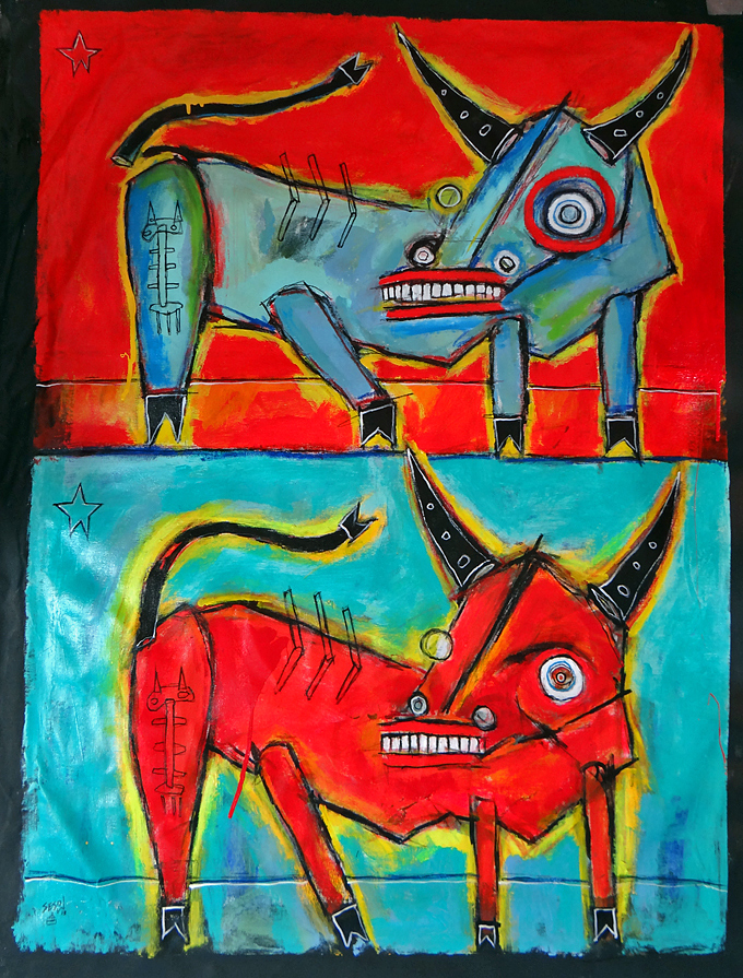 "Two Bulls" acrylic/oil on unstretched canvas approx. 42" x 32" *SOLD email sesow@sesow.com to reserve/ask about purchasing. please include url and description. |