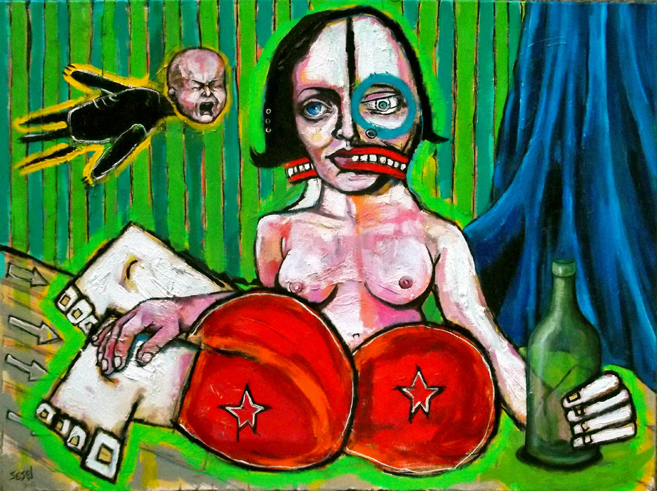 "Red Pants" (from the 2013 "Defiled" series, a collaborative group of paintings with Dana Ellyn mix on stretched canvas 30" x 40" $1000 email sesow@sesow.com to reserve/ask about purchasing. please include url and description. |
