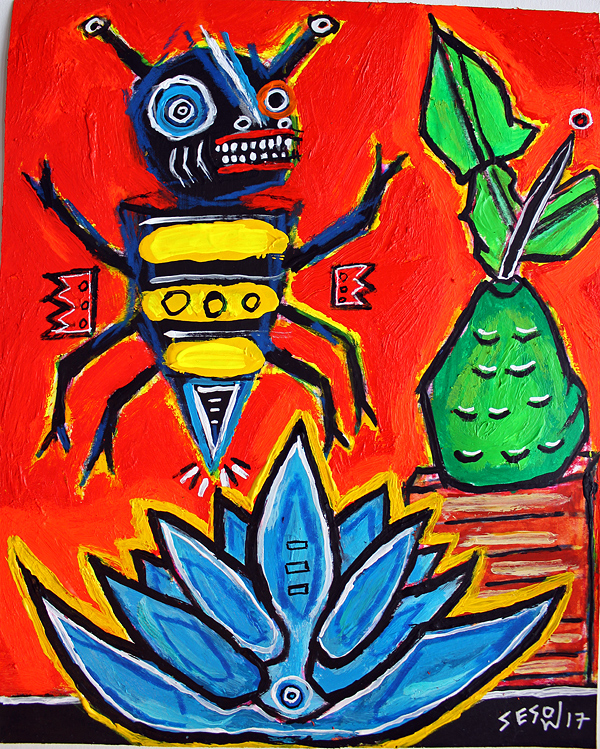 "Bee, with blue agave and kaffir lime" acrylic on archival paper 8" x 10" *SOLD email sesow@sesow.com to reserve/ask about purchasing. please include url and description. |