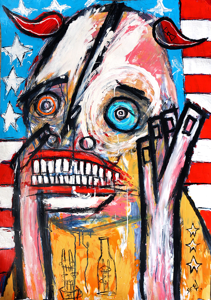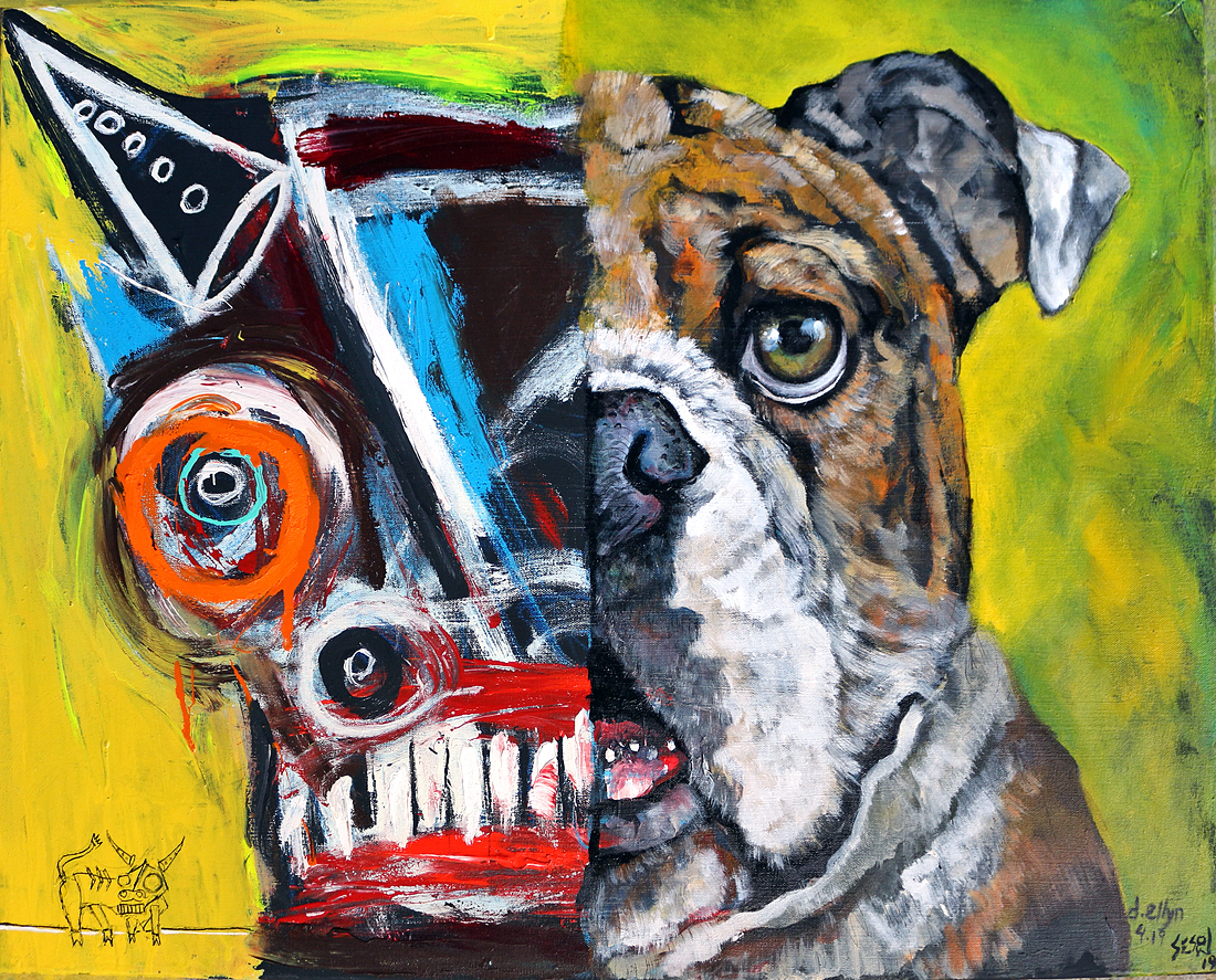"Bull Dog" acrylic/mix on stretched canvasr 30" x 24" *SOLD a 'defiled' series painting in collaboration with Dana Ellyn email sesow@sesow.com to reserve/ask about purchasing. please include url and description. |