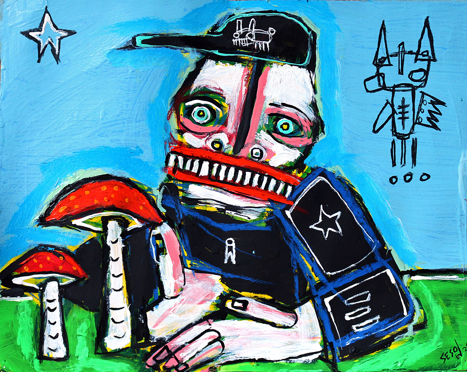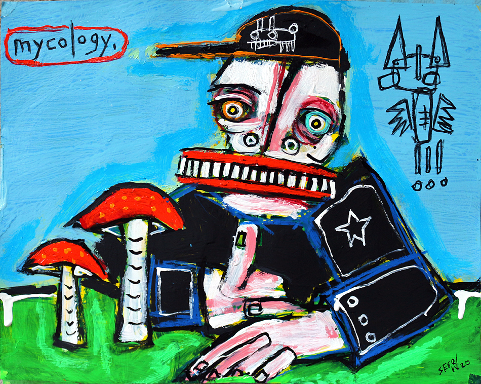 "Fungus Enthusiast" acrylic/mix on archival paper 11" x 14" *SOLD email sesow@sesow.com to reserve/ask about purchasing. please include url and description. |