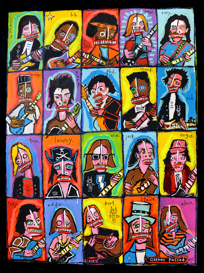 "Axemen Passed" acrylic/mix/oil on unstretched canvas 30" x 40" (extra 2" black border surronds, making total size 34" x 44)" *SOLD email sesow@sesow.com to reserve/ask about purchasing. please include url and description. |