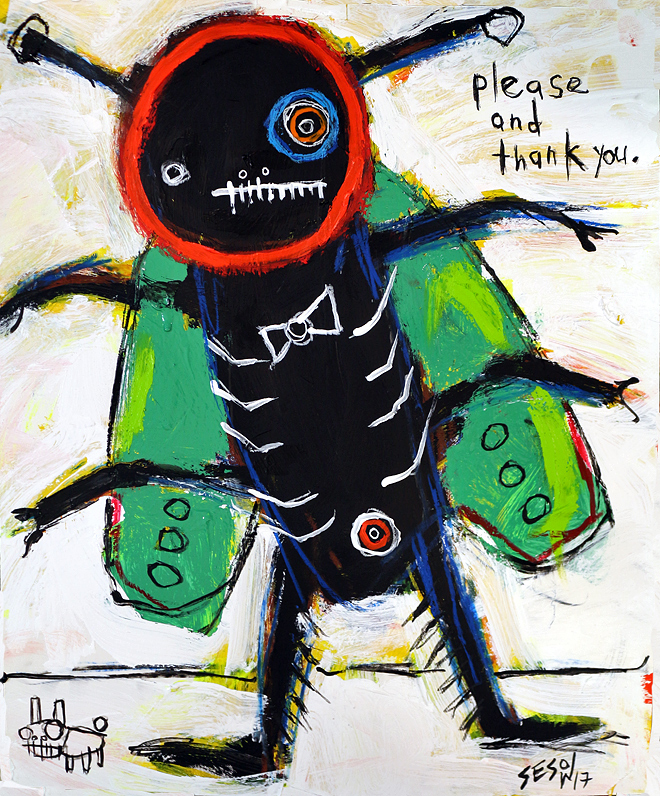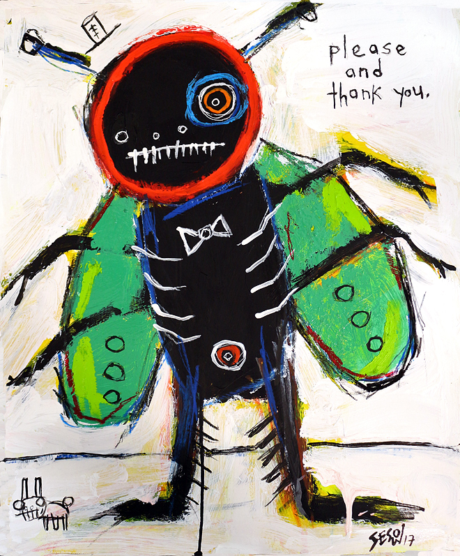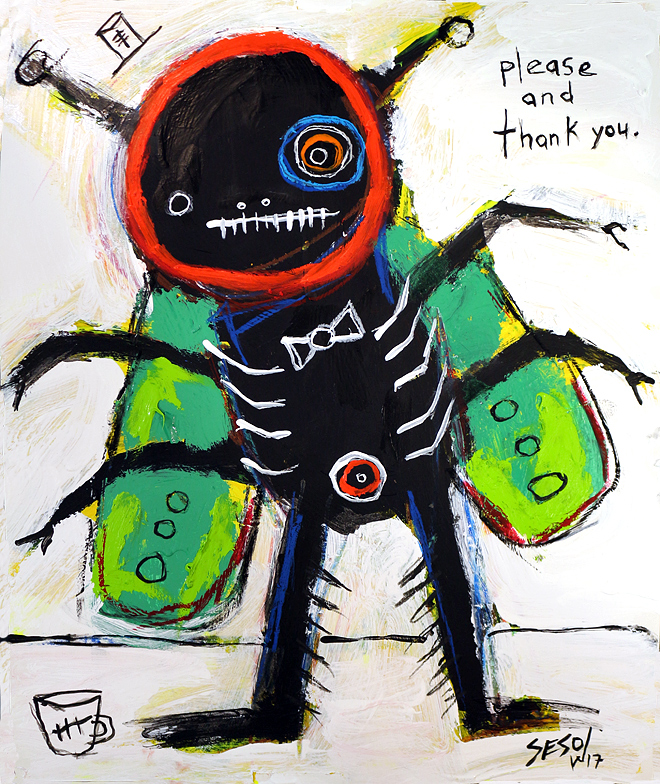 "Proper Cricket", please and thank you acrylic on archival bristol paper 14"x17" *SOLD email sesow@sesow.com to reserve/ask about purchasing. please include url and description. |