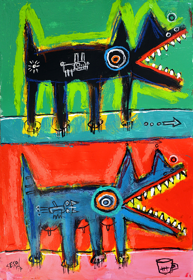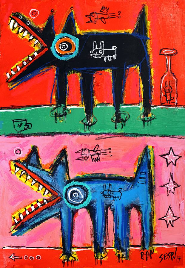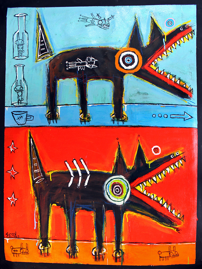 "Hair of the Dogs" acrylic on archival watercolor paper 22" x 15" *SOLD email sesow@sesow.com to reserve/ask about purchasing. please include url and description. |