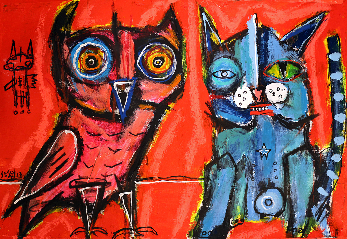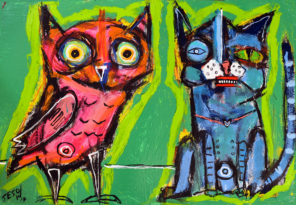"Red Owl and Pussycat" acrylic on archival watercolor paper 22" x 15" *SOLD email sesow@sesow.com to reserve/ask about purchasing. please include url and description. |