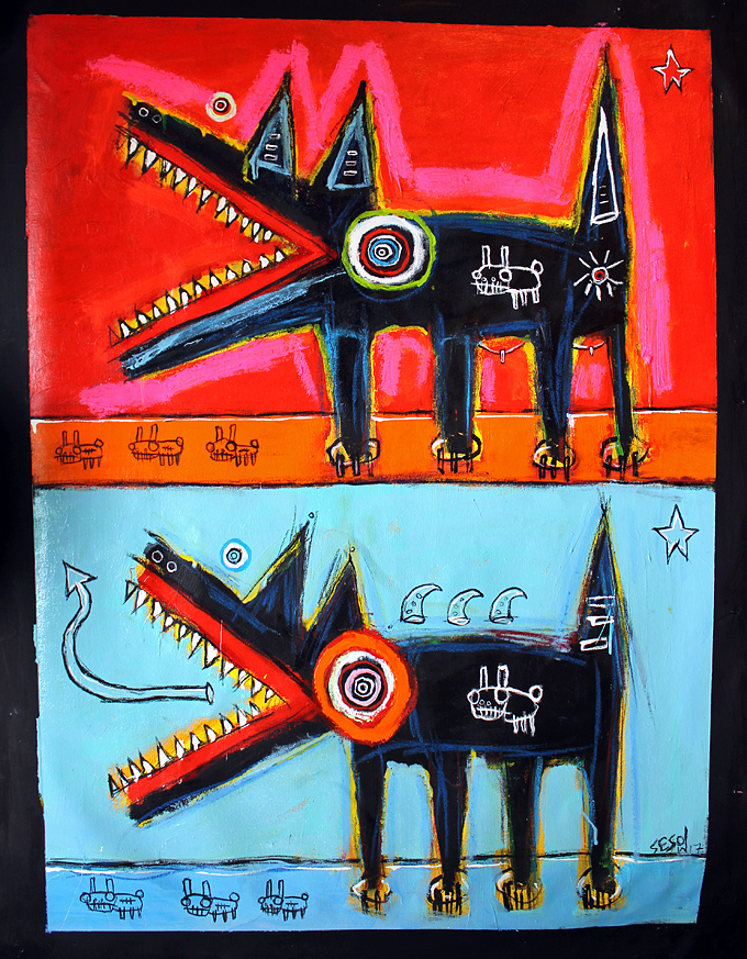 "Pack of Dogs (follow the leader)" acrylic/oil on unstretched canvas approx 30" x 41" (with approx 2" additional black border) *SOLD email sesow@sesow.com to reserve/ask about purchasing. please include url and description. |