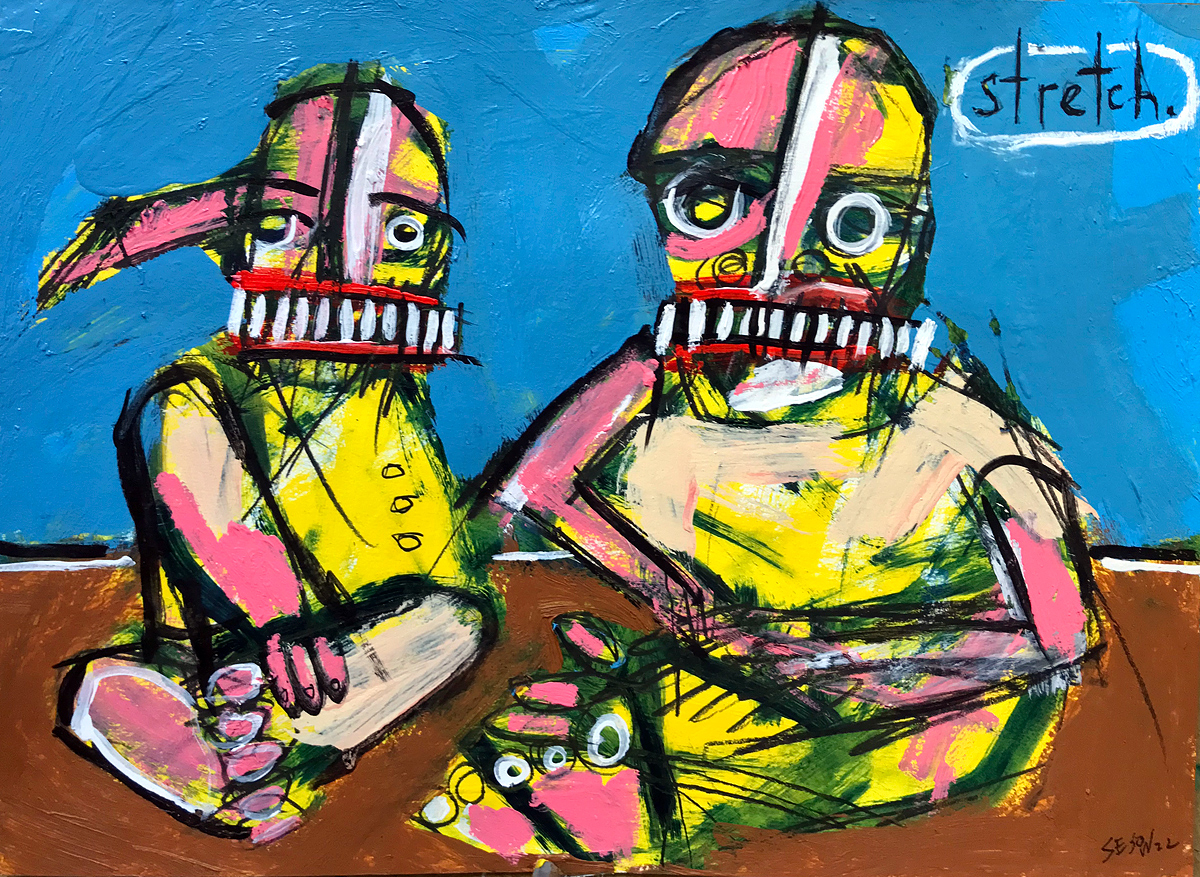"Don't Forget to Stretch" acrylic/mix on watercolor paper 15" x 11" *SOLD email sesow@sesow.com to reserve/ask about purchasing. please include url and description. |