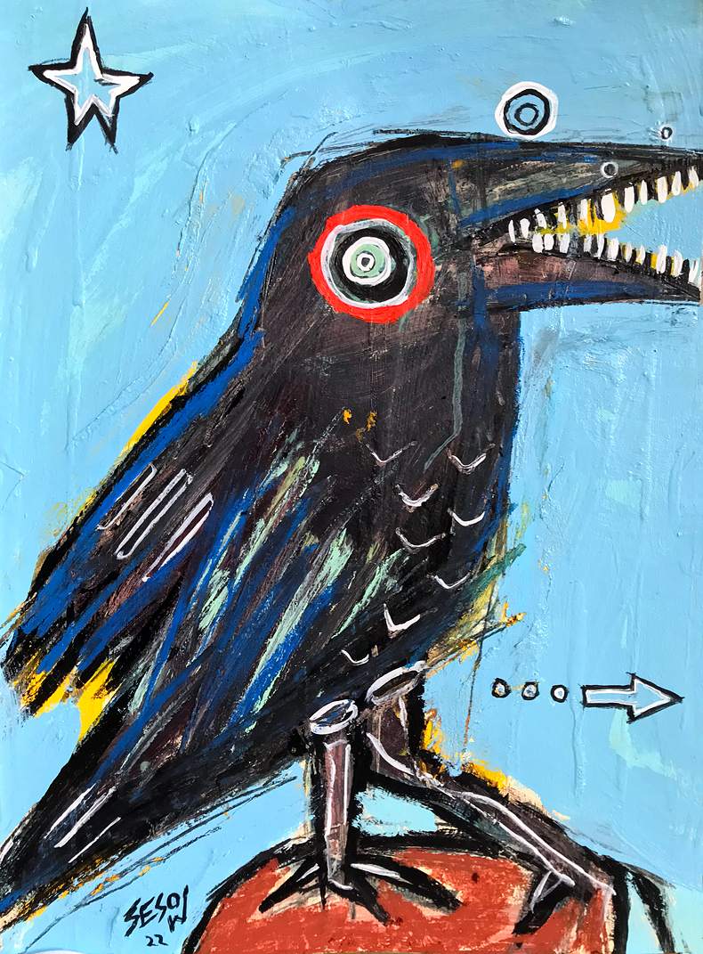 "Happy Raven" acrylic/oil on watercolor paper 11" x 15" *SOLD email sesow@sesow.com to reserve/ask about purchasing. please include url and description. |