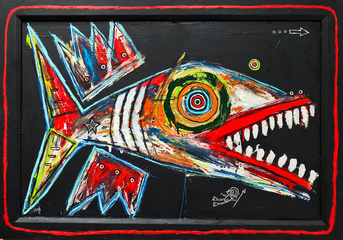 "Trophy Fish" acrylic/oil on board canvas (framed) 28" x 40" (includes frame) *SOLD email sesow@sesow.com to reserve/ask about purchasing. please include url and description. |