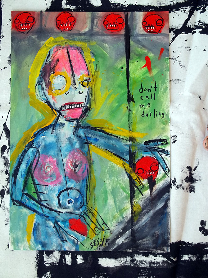 "Don't Call me Darling" Made in Spain (October 2011) acrylic/mix on archival paper 22" x 15" currently represented at Gallery Artevistas in Barcelona, Spain they ship internationally, contact them here |