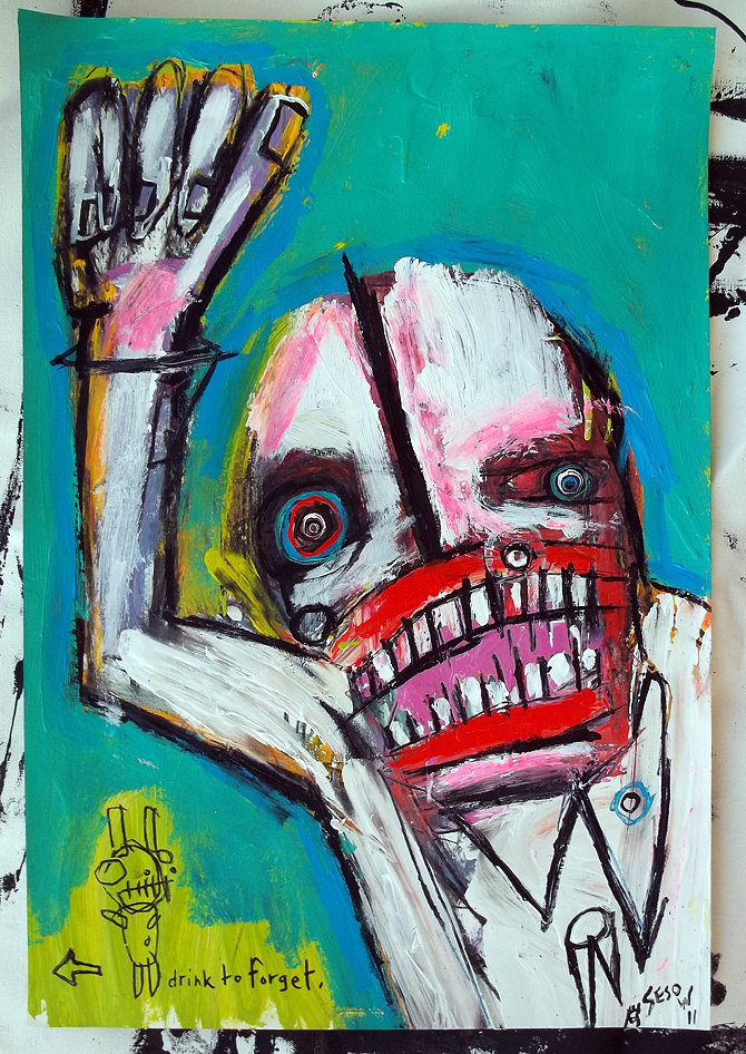 "Drink to Forget" Made in Spain (October 2011) acrylic/mix on archival paper 22" x 15" currently represented at Gallery Artevistas in Barcelona, Spain they ship internationally, contact them here |