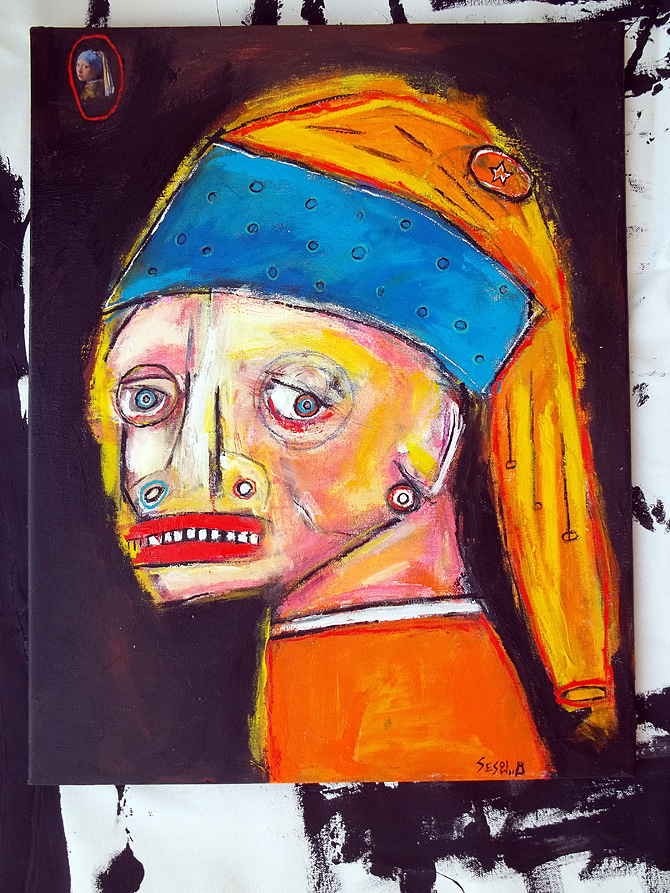 "Girl With Pearl" Made in Spain (October 2011) acrylic/mix on stretched canvas approx 18" x 16" currently represented at Gallery Artevistas in Barcelona, Spain they ship internationally, contact them here |