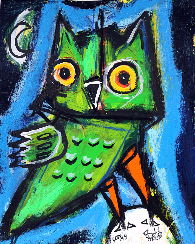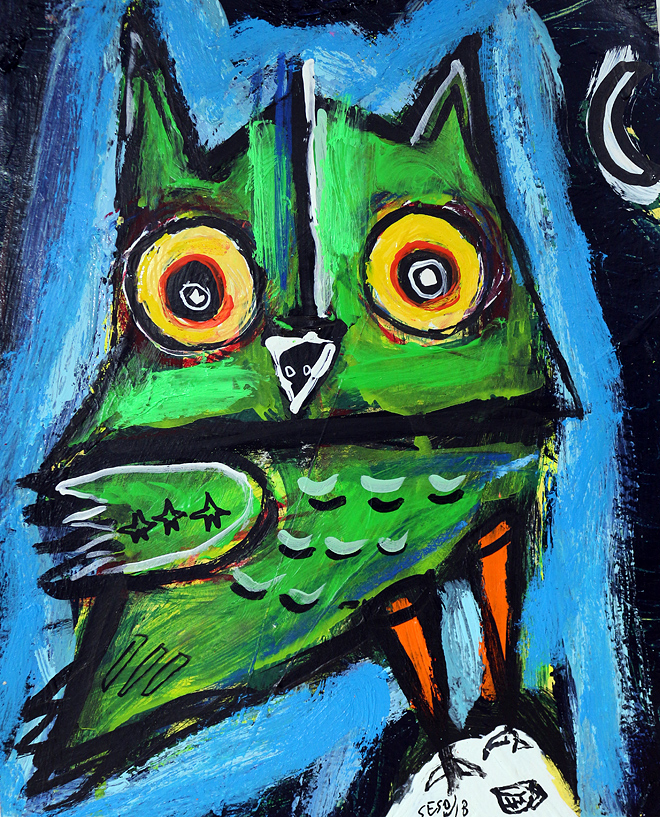 "Small Green Owl" acrylic/oil on archival archival paper 8" x 10" *SOLD email sesow@sesow.com to reserve/ask about purchasing. please include url and description. |