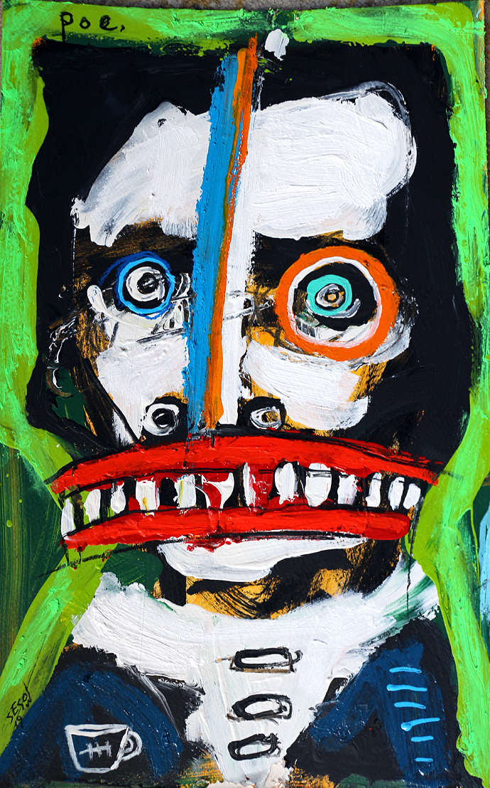 "Poe (green background)" acrylic/mix on matboard approx. 17" x 10.5" *SOLD email sesow@sesow.com to reserve/ask about purchasing. please include url and description. |