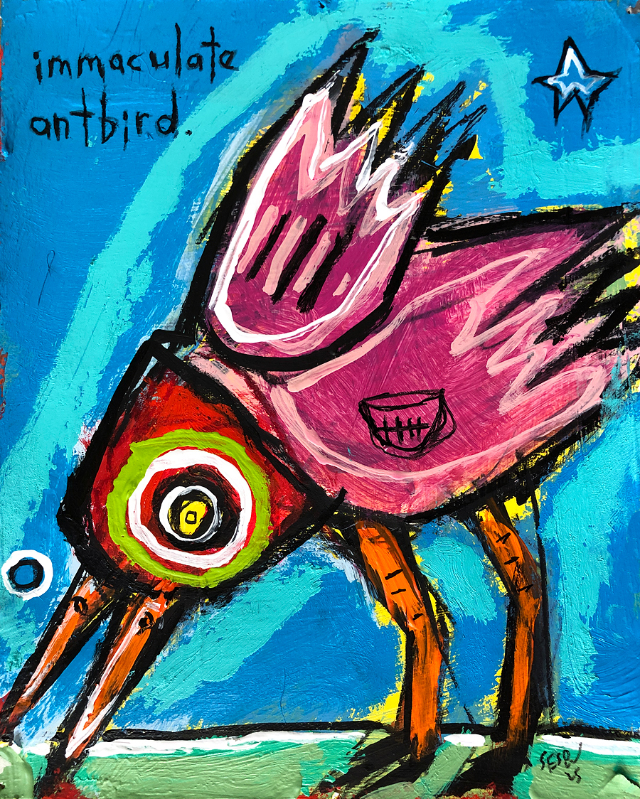 "Immaculate Antbird" acrylic/oil on archival paper 8" x 10" *SOLD email sesow@sesow.com to reserve/ask about purchasing. please include url and description. |