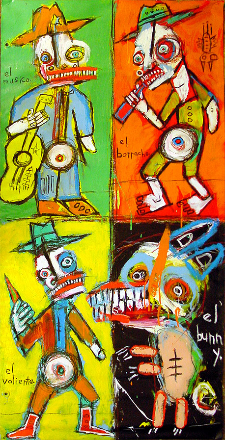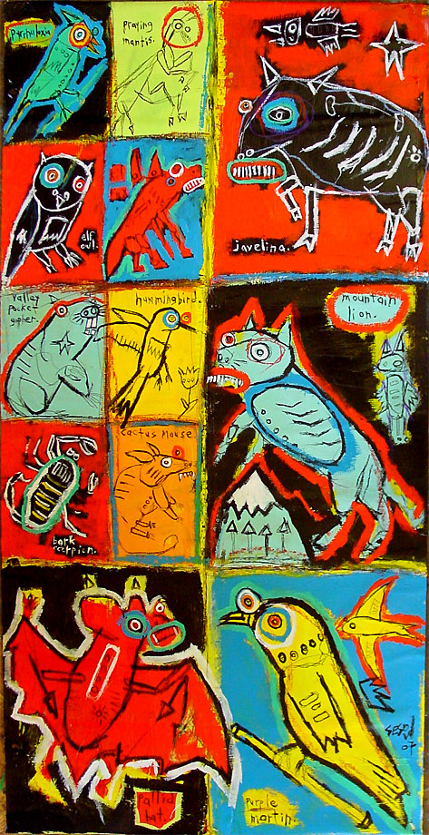 "Arizona desert creatures" 48" x 24" acrylic, oil stick, crayon on DC street banner *SOLD |