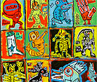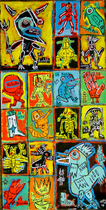 "Loteria" 48" x 24" acrylic,crayon, livestock tagging pen on DC street banner *SOLD |