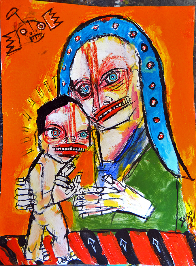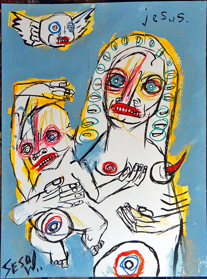 "Fidgety Baby Jesus" mix on watercolor paper 9.5" x 11.5" *SOLD email sesow@sesow.com to reserve/ask about purchasing. please include url and description. |
