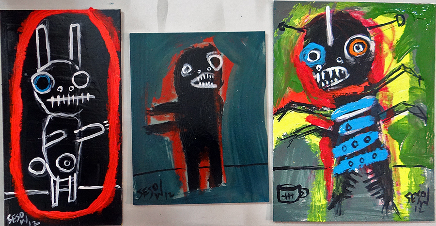 Original Small Paintings (sept. 2012) acrylic/mix on matboard sizes vary, approx. 4" x 7" *SOLD email sesow@sesow.com to reserve/ask about purchasing. please include url and description. |