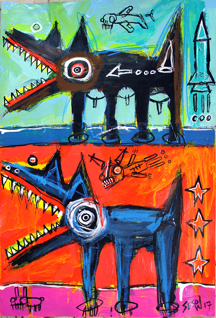"War Dogs" acrylic.mix on archival paper 22" x 15" *SOLD email sesow@sesow.com to reserve/ask about purchasing. please include url and description. |