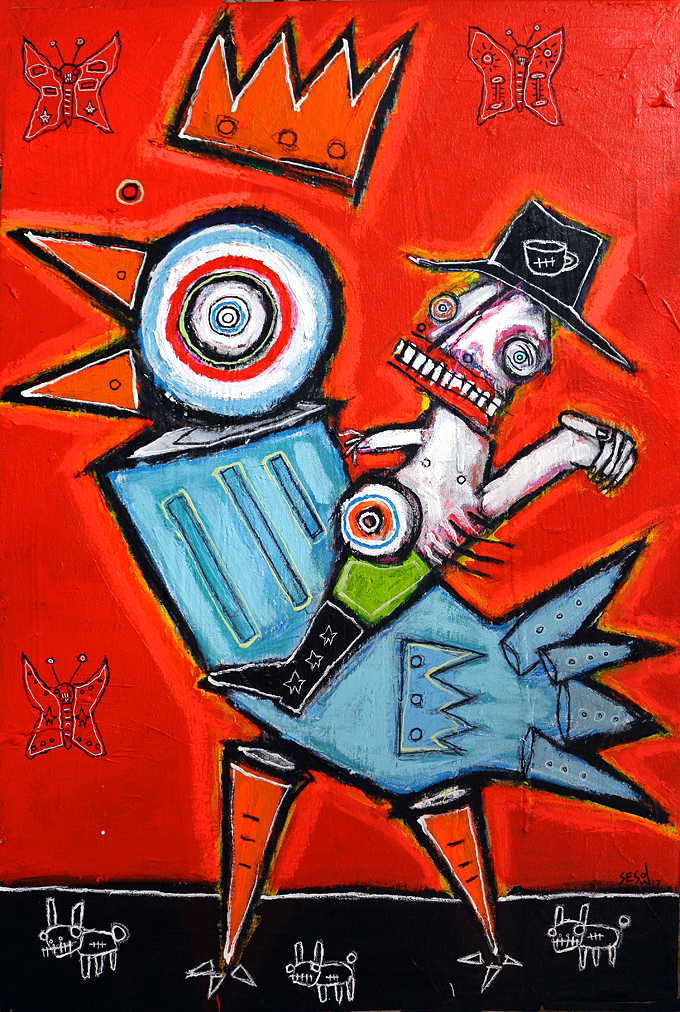 "Riding a Blue Chicken Through the Briar Patch, with butterflies" acrylic/oil on stretched canvas 36" x 24" *SOLD email sesow@sesow.com to reserve/ask about purchasing. please include url and description. |