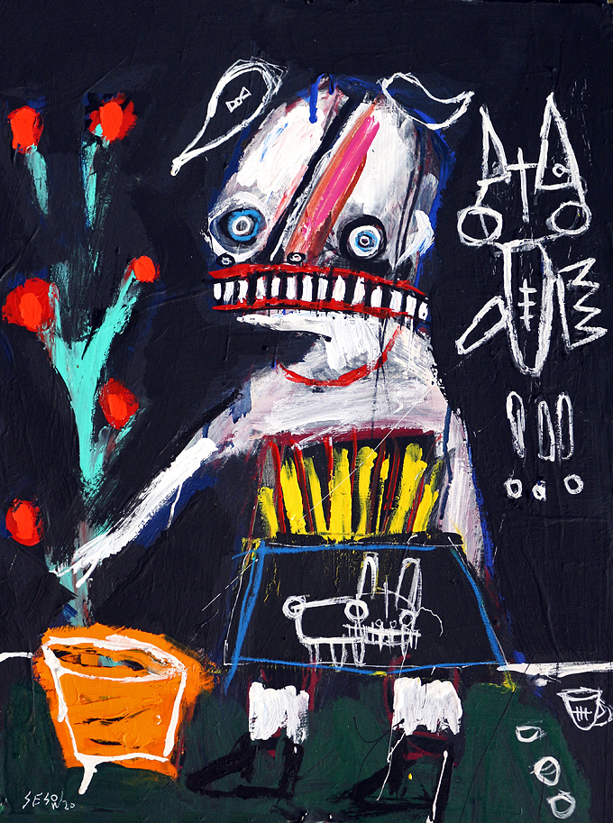 "Edgar" A 'defiled' collaboration painting with Dana Ellyn acrylic/mix on paper 12" x 18" *SOLD email sesow@sesow.com to reserve/ask about purchasing. please include url and description. |