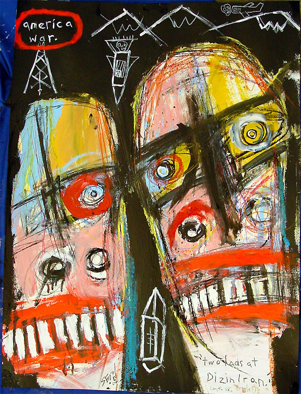 "Two Lads at Dizin Iran ski slope (with american bombers)" 22" x 30" oil/mixed on watercolor paper *SOLD |