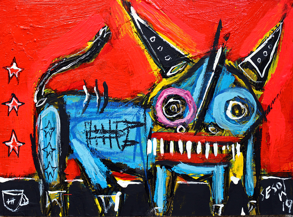 "Bull, with three stars and a trauma cup" acrylic/mix on matboard approx. 9" x 11" *SOLD email sesow@sesow.com to reserve/ask about purchasing. please include url and description. |