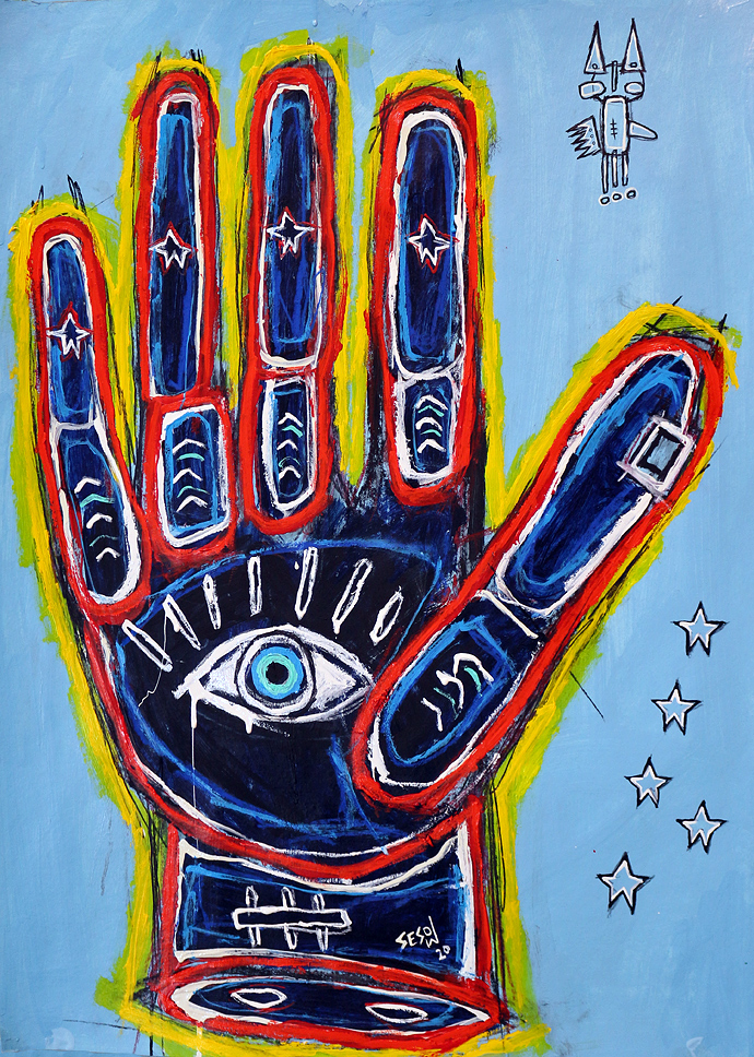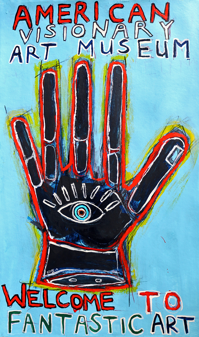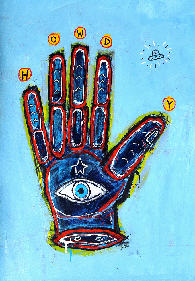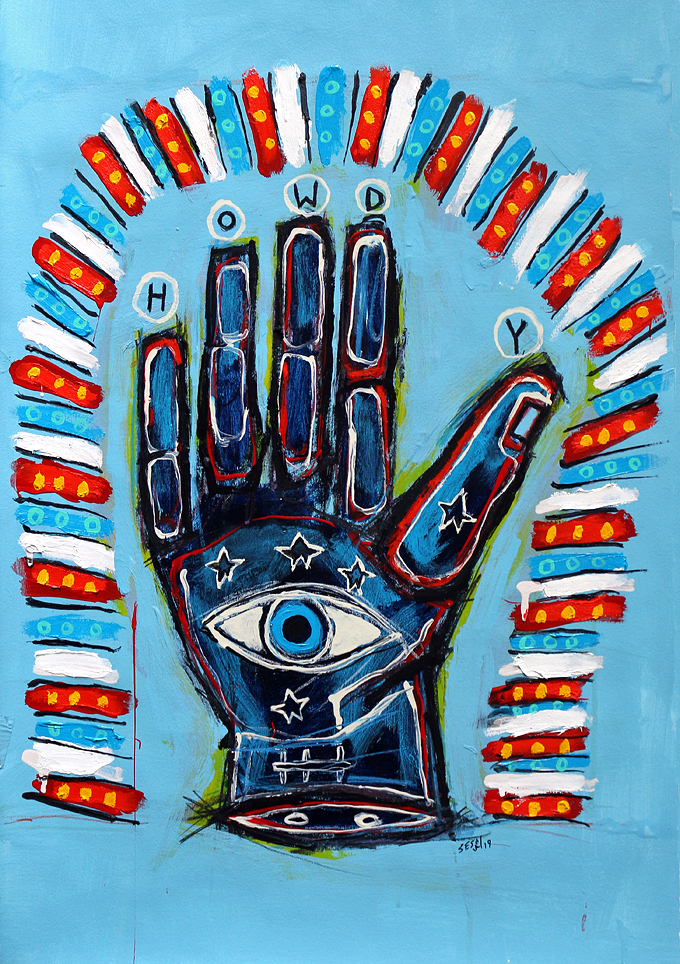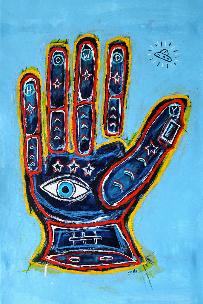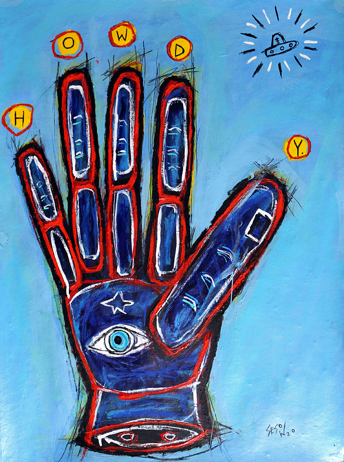 "Howdy Hand" inspired by painting used at the American Visionary Art Museum (outside the museum banner) in Baltimore by Matt Sesow (2020) acrylic/mix on watercolor paper approx. 23" x 31" *SOLD email sesow@sesow.com to reserve/ask about purchasing. please include url and description. |