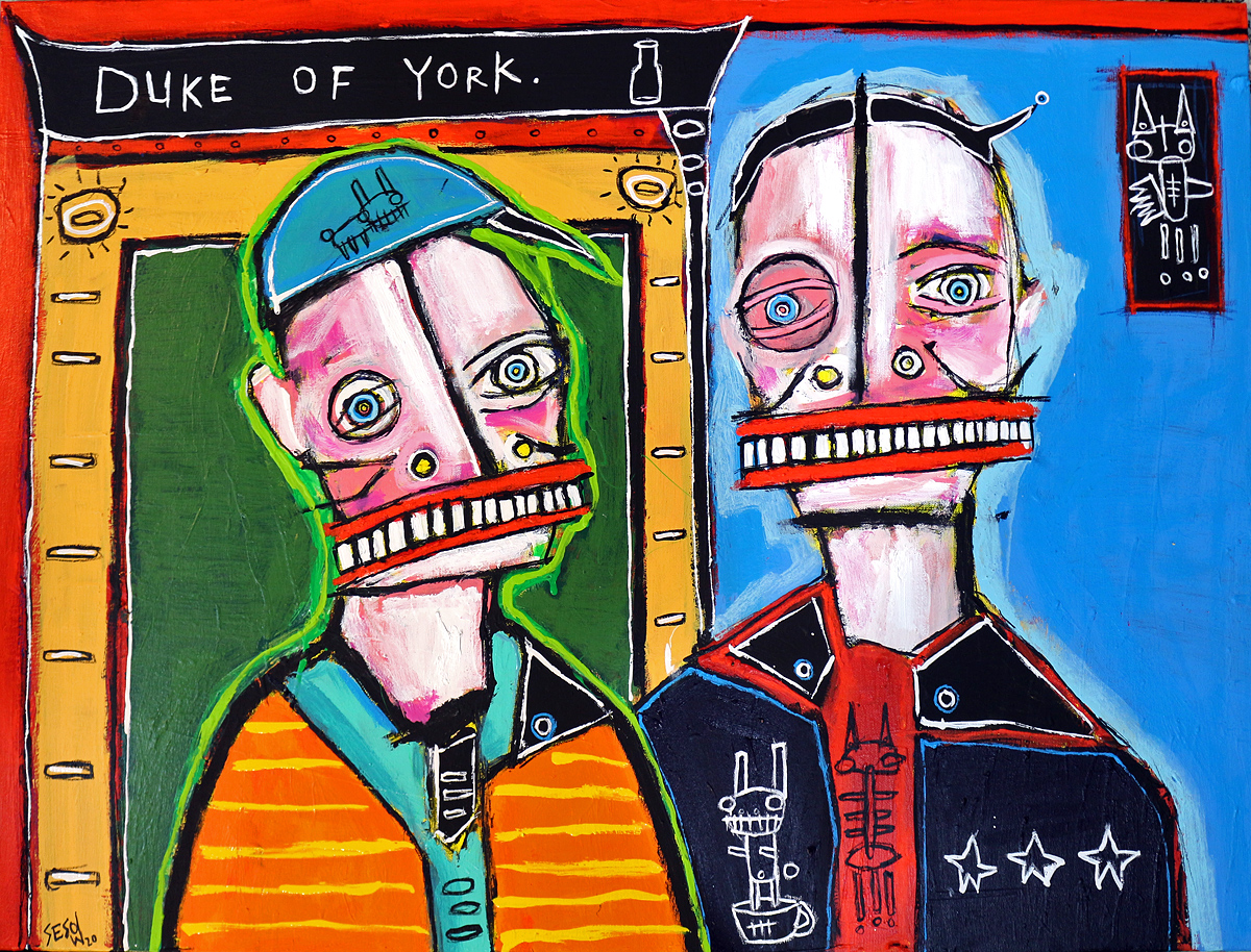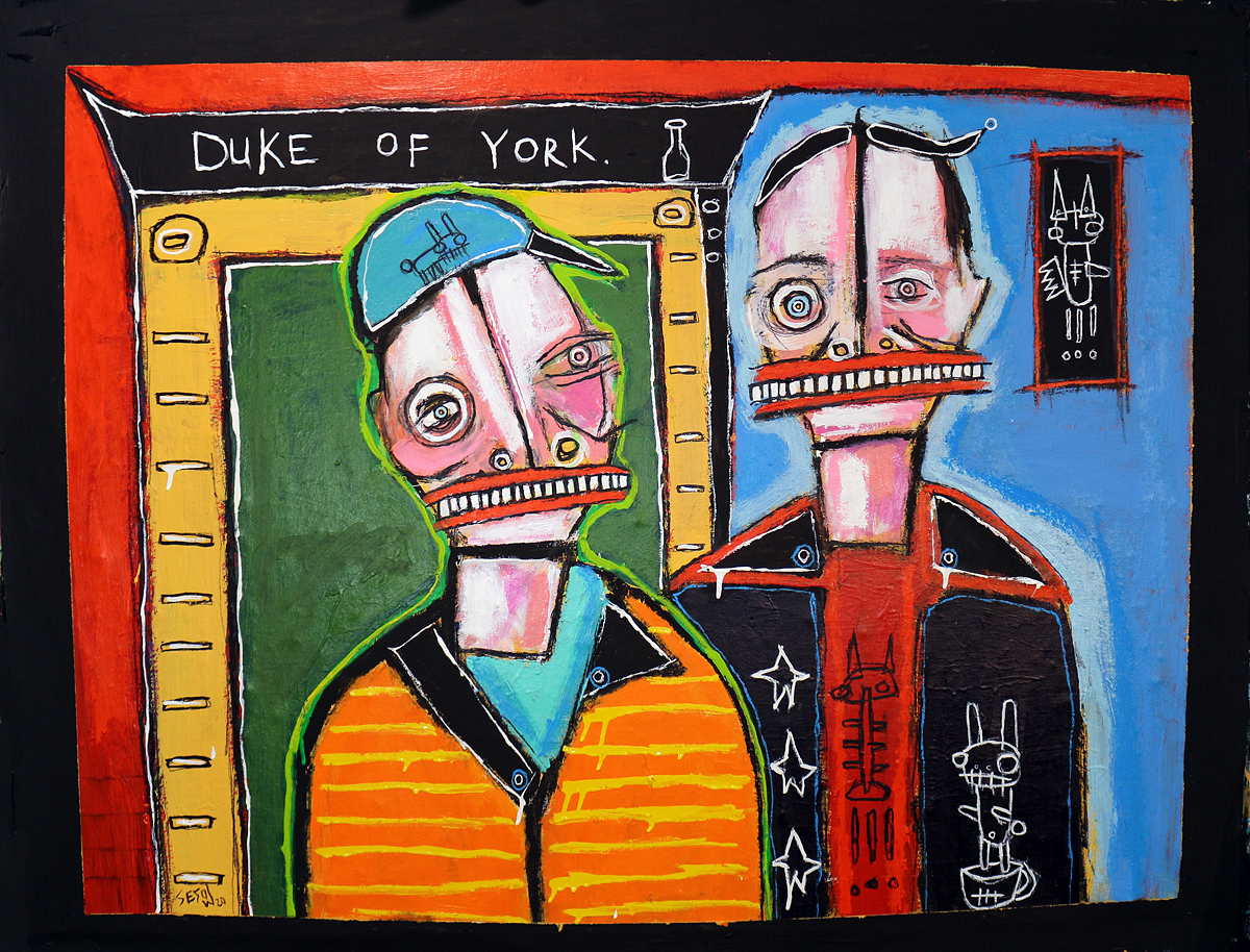 "Brothers (at the duke of york)"" oil/acrylic on unstretched canvas 30" x 40" *SOLD email sesow@sesow.com to reserve/ask about purchasing. please include url and description. |