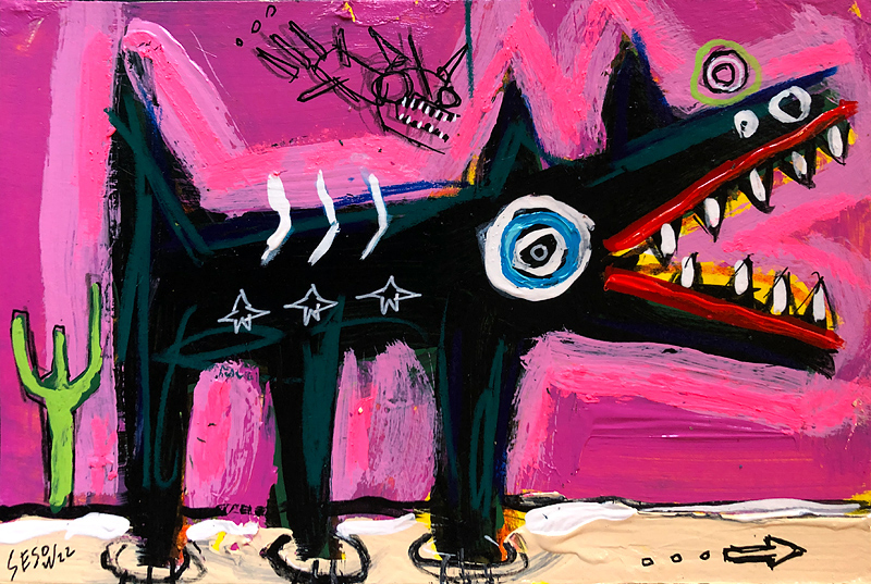 "Dog with Saguaro (with banshee)" acrylic/mix on watercolor paper 6" x 9" *SOLD email sesow@sesow.com to reserve/ask about purchasing. please include url and description. |