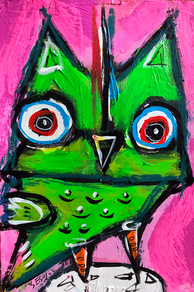 "Small Green Owl" acrylic/oil on watercolor paper 6" x 9" *SOLD email sesow@sesow.com to reserve/ask about purchasing. please include url and description. |
