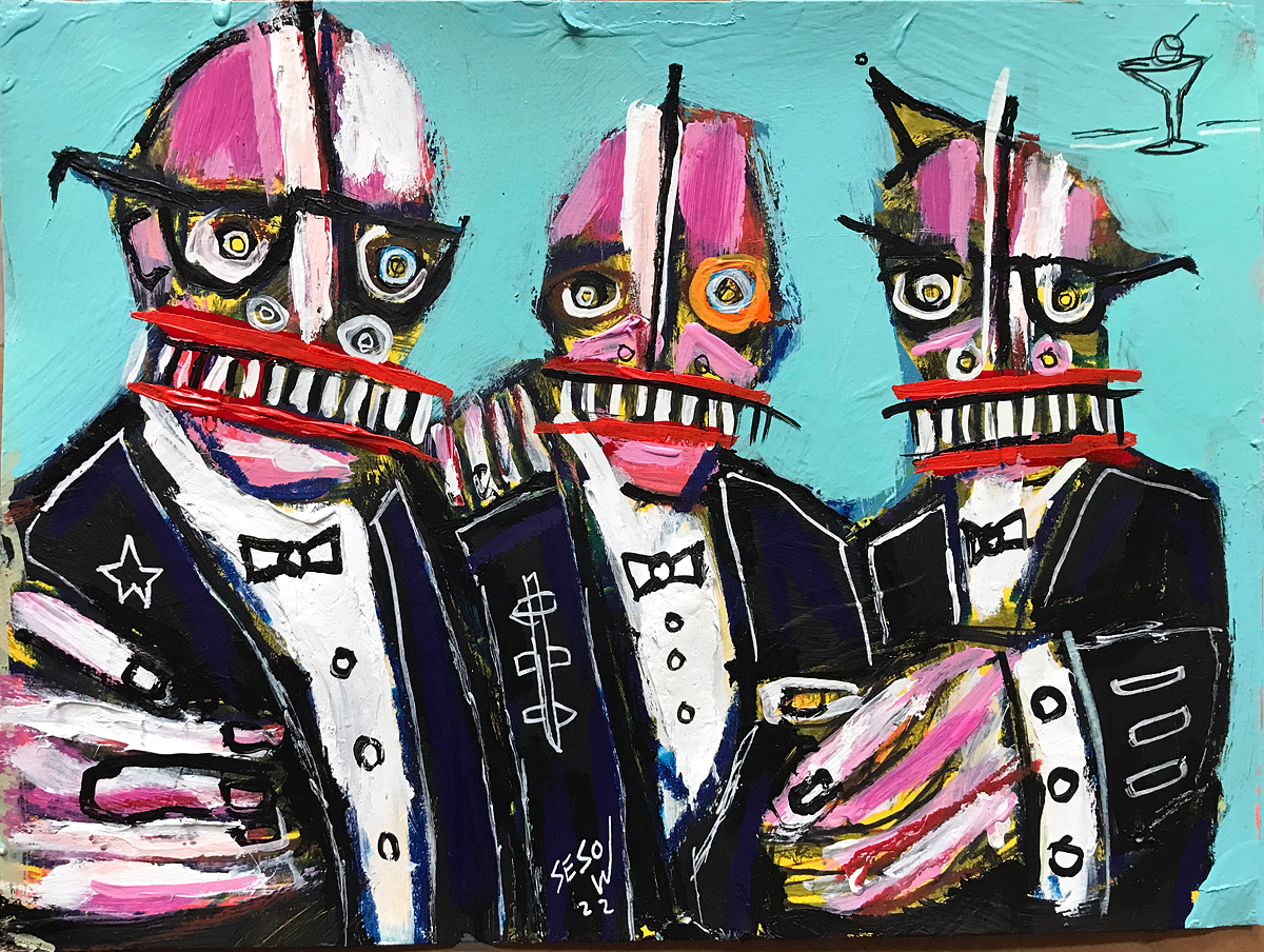 "Swell Fellas" acrylic/mix on watercolor paper 9" x 12" *SOLD email sesow@sesow.com to reserve/ask about purchasing. please include url and description. |