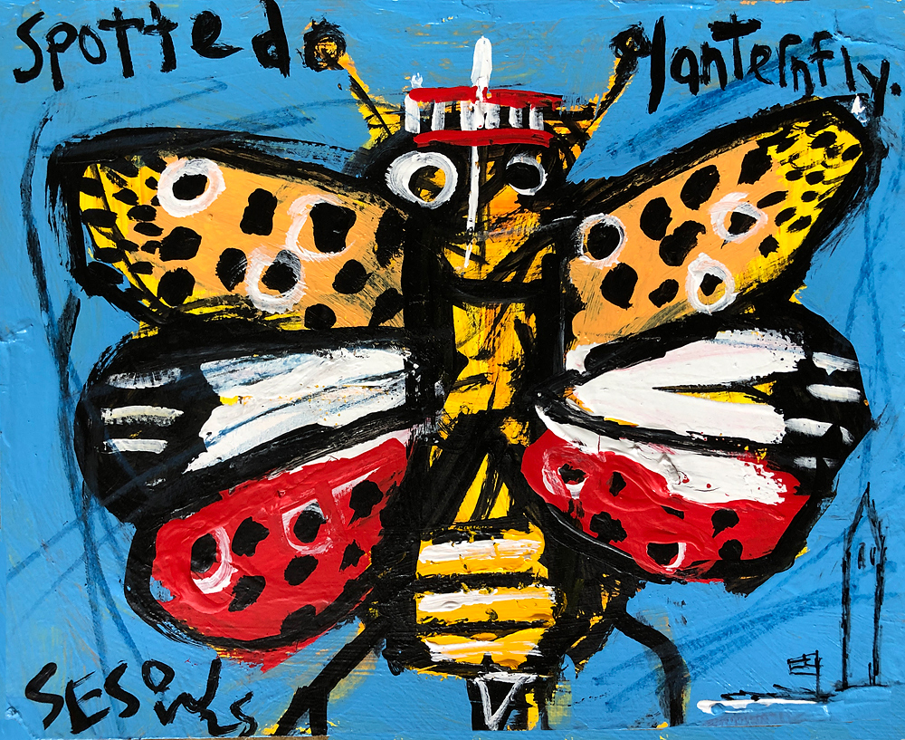 "A spotted lanternfly" acrylic/mix on watercolor paper 8" x 10" *SOLD email sesow@sesow.com to reserve/purchase. |