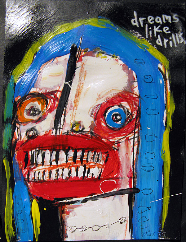 "Dreams Like Drills" 9" x 12" acrylic/oil on bristol paper *SOLD created for the play "all you can eat" in san francisco, september 2008 |