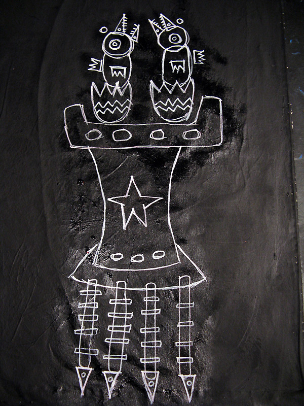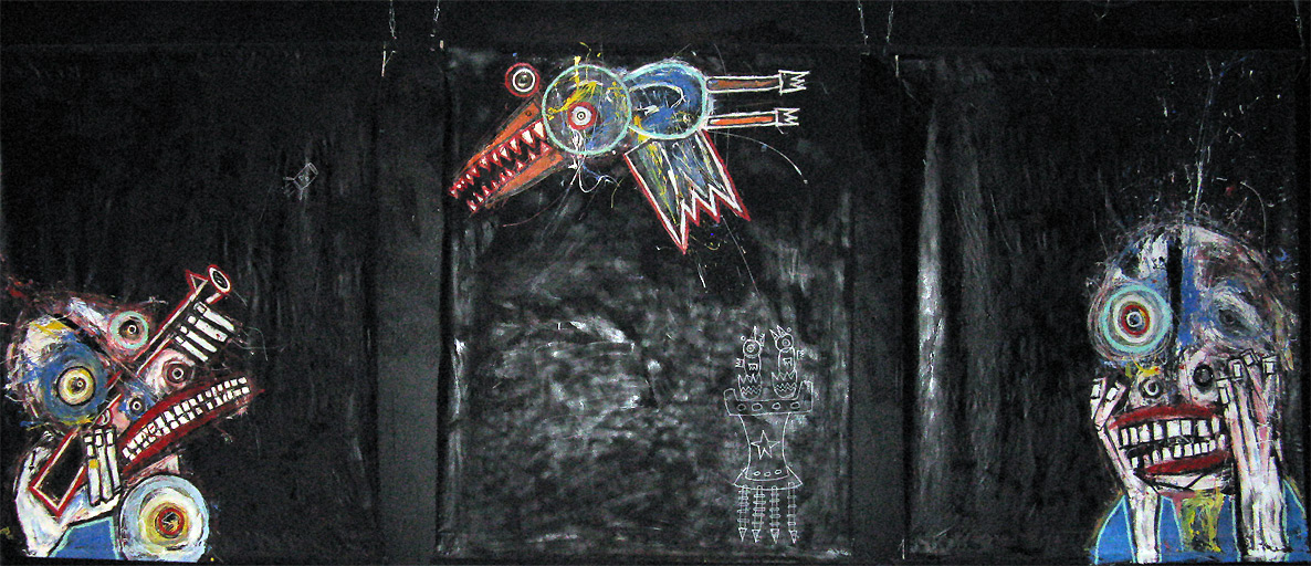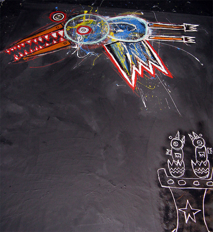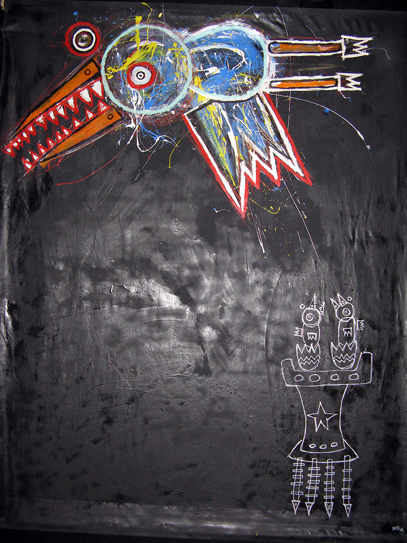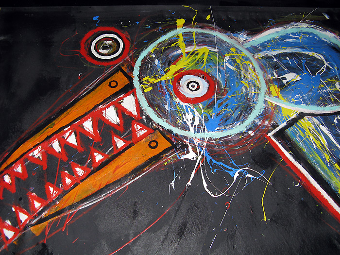 "Fleeing the Roost" 9feet x 7feet acrylic/house paint/oil crayon on unstretched canvas *SOLD created for the play "all you can eat" in san francisco, september 2008 click for full painting click for detail #1 click for detail #2 "all you can eat" set paintings |