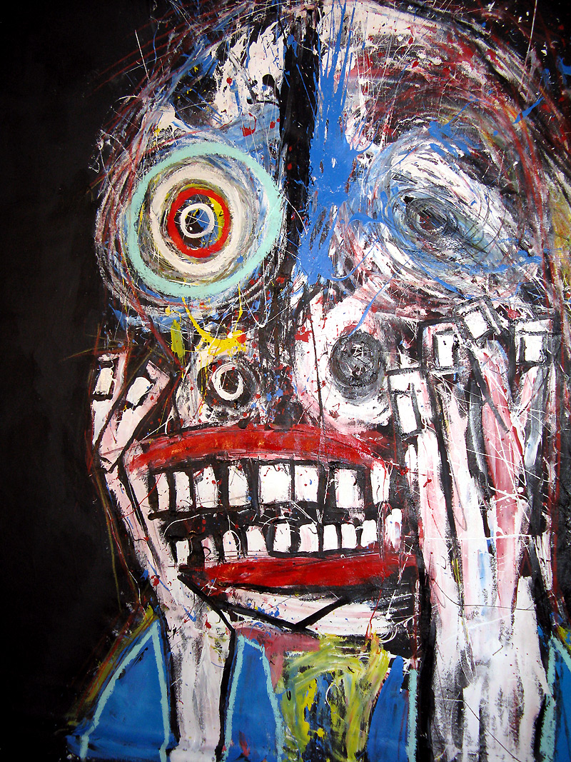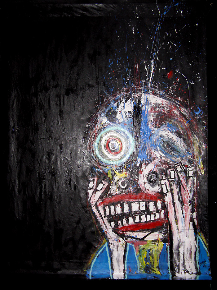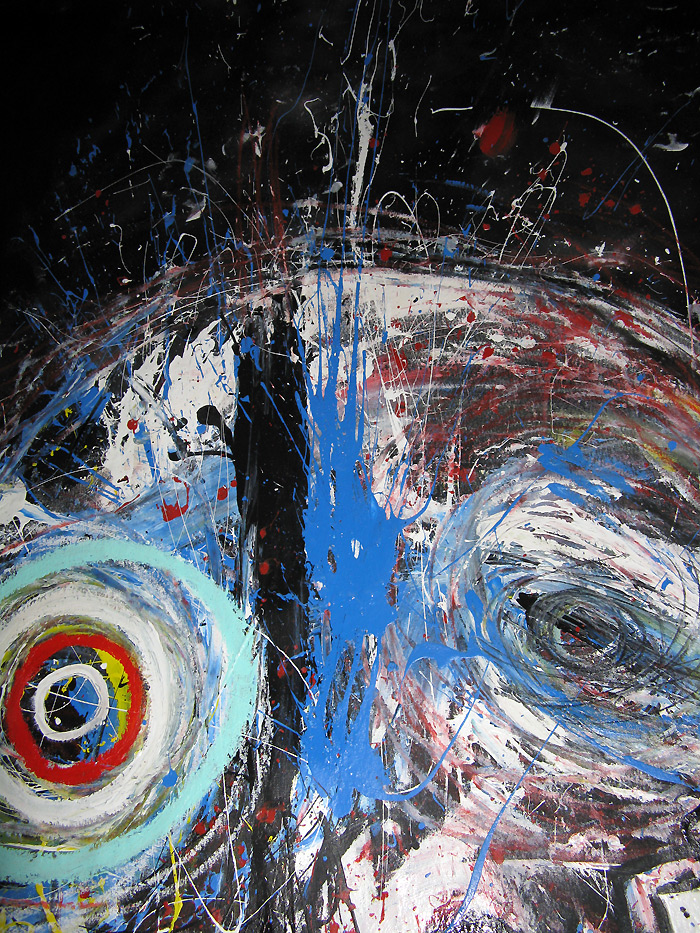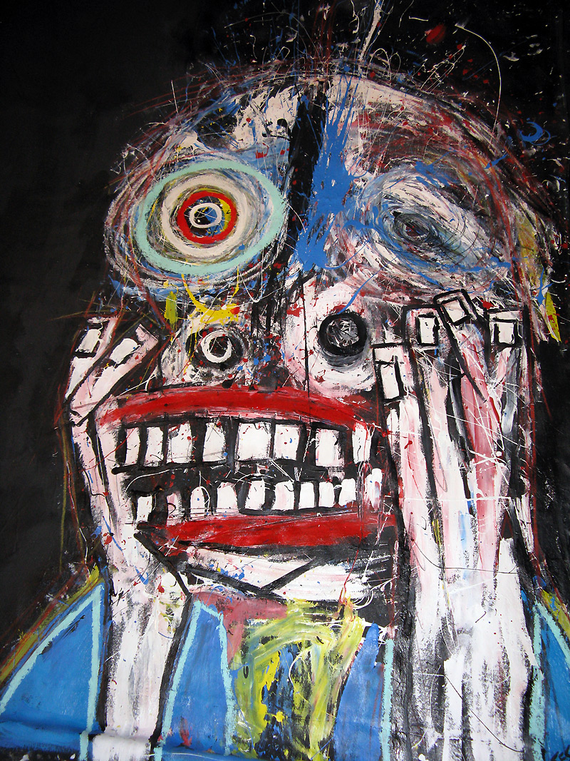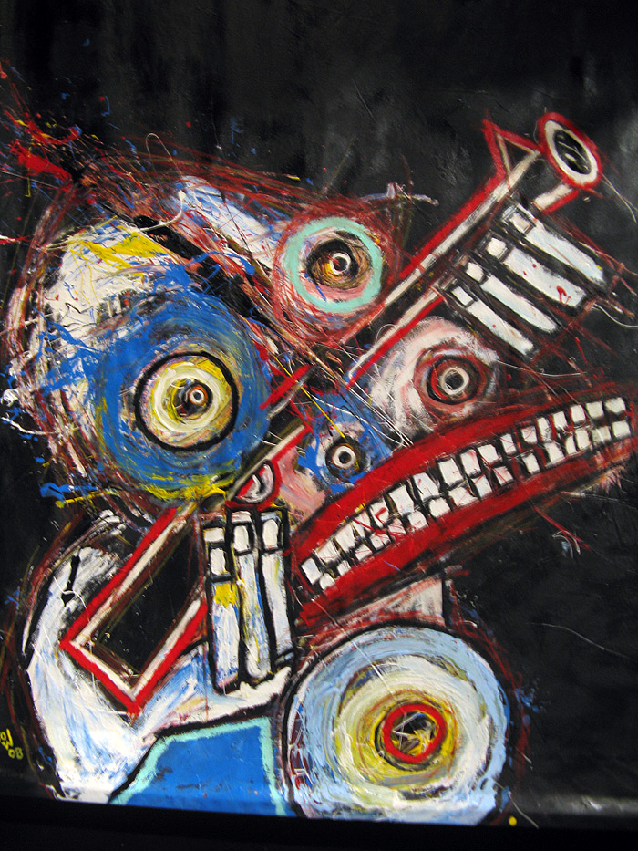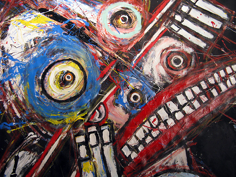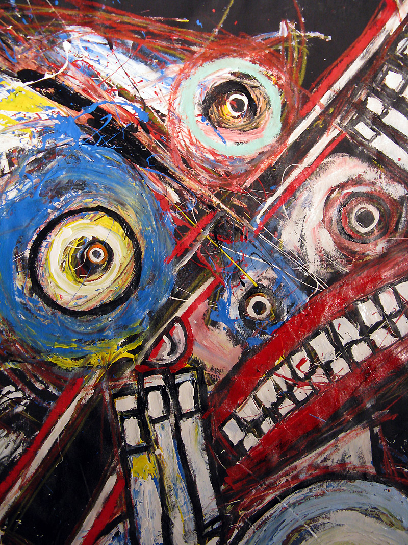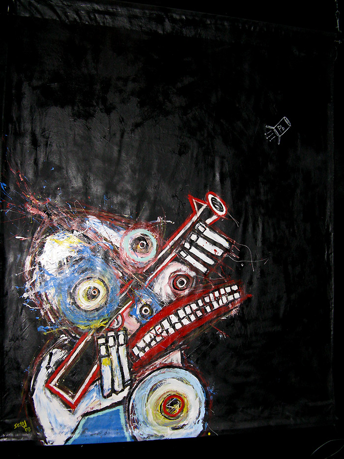 Shot in the Dark" 9feet x 7feet acrylic/house paint/oil crayon on unstretched canvas $2000 created for the play "all you can eat" in san francisco, september 2008 click for full painting click for detail #1 click for detail #2 click for detail #3 click for detail #4 click for detail #5 "all you can eat" set paintings |