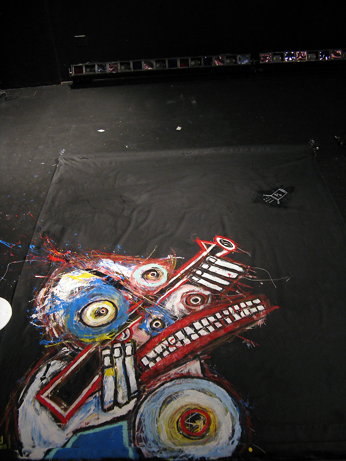 "Personal Upheaval" 9feet x 7feet acrylic/house paint/oil crayon on unstretched canvas $2000 created for the play "all you can eat" in san francisco, september 2008 click for full painting click for detail #1 click for detail #2 click for detail #3 click for detail #4 "all you can eat" set paintings |