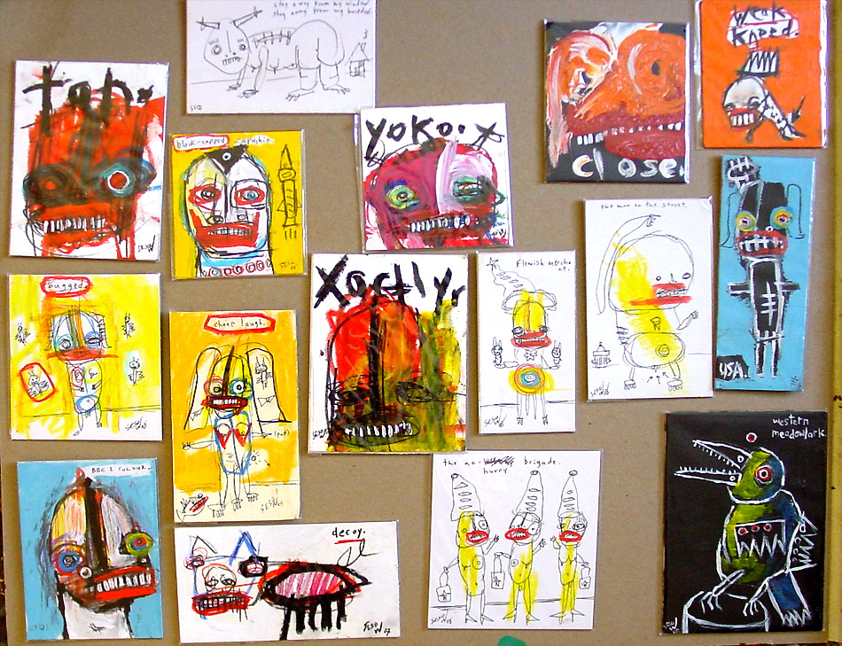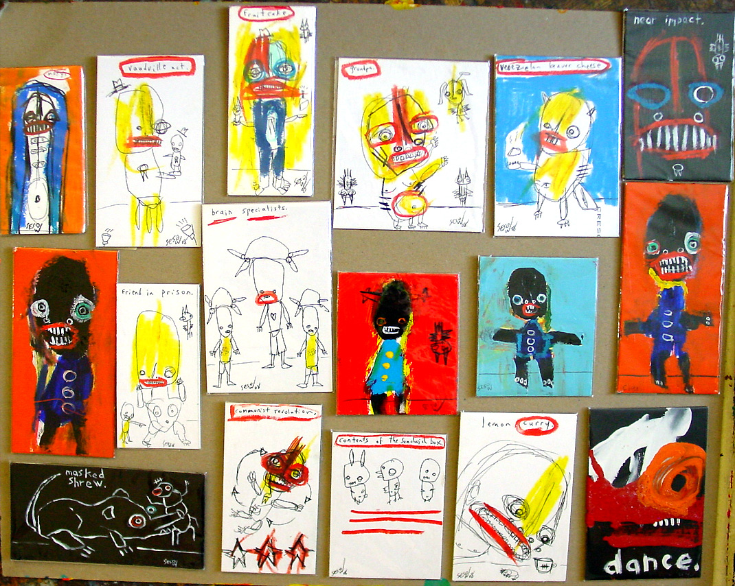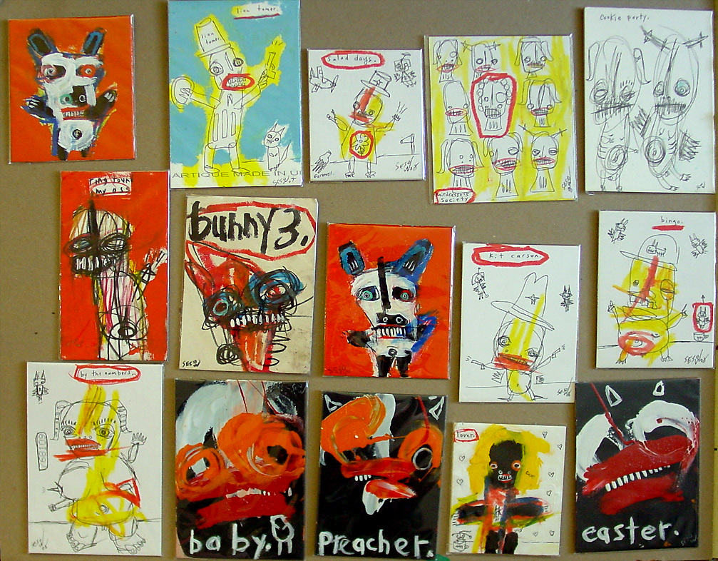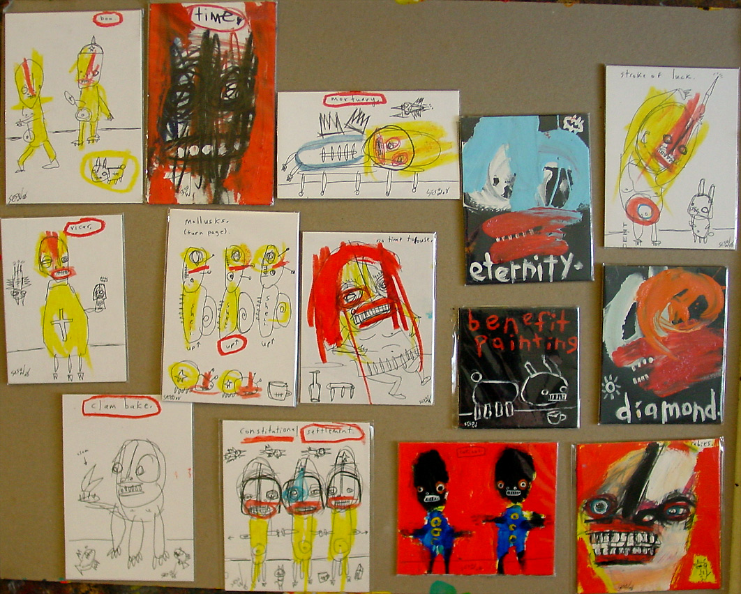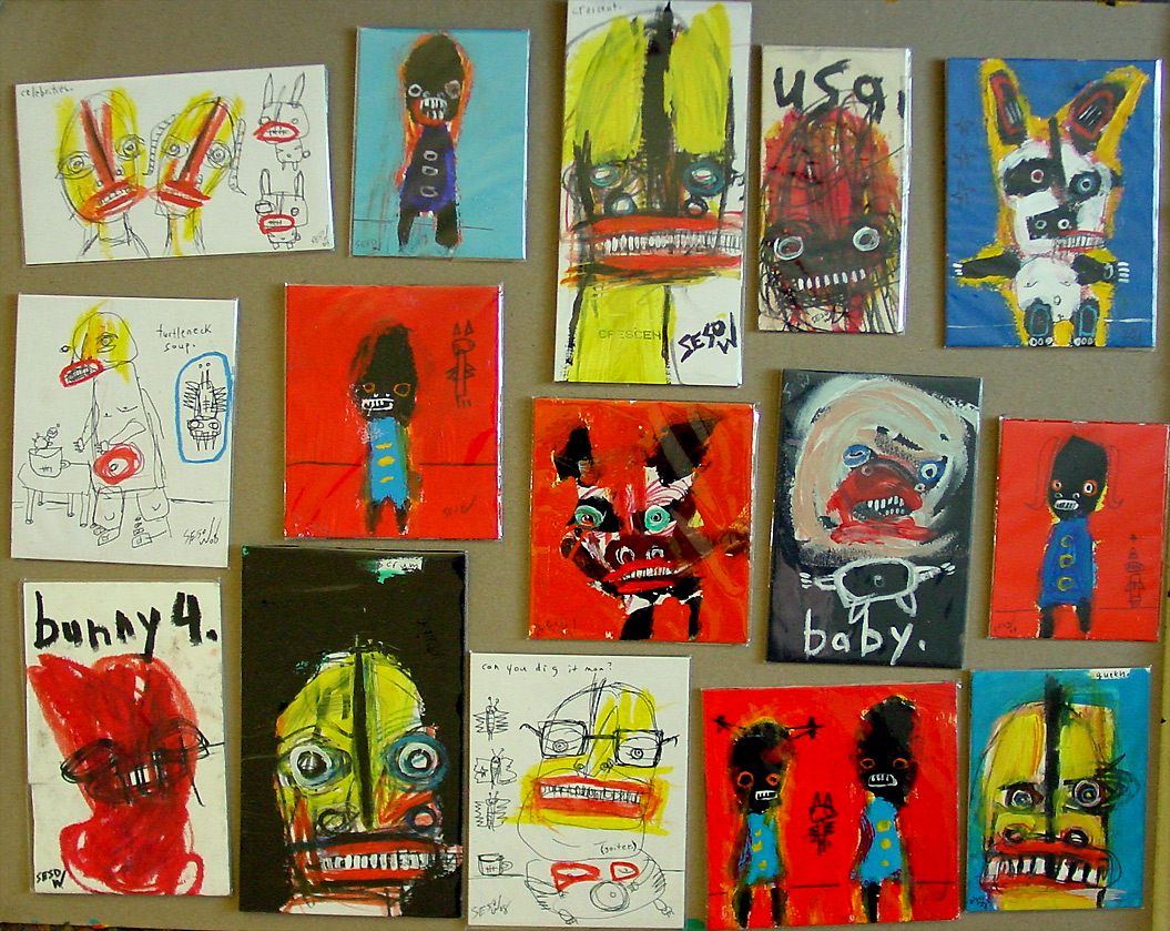 Small paintings, September 2008 approx. 4" x 6" acrylic/mixed on archival matboard (shown in clear plastic bag) $35 shipped email sesow.com to reserve |